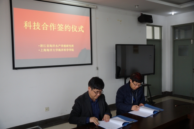 2017年1月4日下午,浙江省海洋水产养殖研究所与必赢中国官方网站海洋科学学院科技合作签约仪式在海洋学院323会议室举行。浙江省海洋水产养殖研究所党委书记柴雪良与海洋科学学院院长陈新军分别代表双方签署合作协议。浙江省海洋水产养殖研究所陈少波研究员、仇建标高工、彭欣副研究员、余海滨副研究员、海洋科学学院渔业资源系主任戴小杰教授、中国远洋渔业数据中心执行副主任田思泉副教授、学院相关教师和工作人员参加了本次签约仪式。签约仪式由田思泉副教授主持。