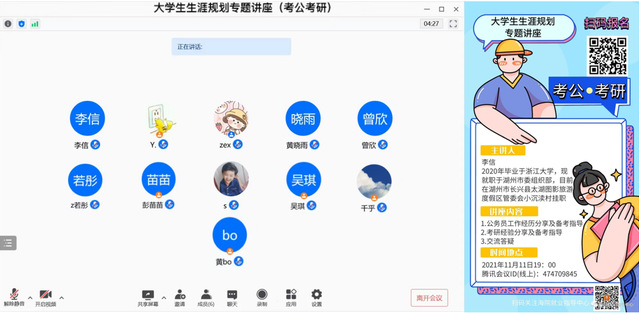 近年来,越来越多的大学毕业生将职业锁定在公务员,国家公务员考试的竞争愈演愈烈。为帮助毕业生们更好地了解公务员这一职业及相关考试政策,提升备考技能,进一步增强复习的针对性和实效性。2021年11月11日,海洋科学学院于线上举办了2022届毕业生公务员备考指导讲座。此次讲座邀请到浙江大学2020届硕士毕业生、湖州市选调生李信作为主讲嘉宾,部分有考公意向的2022届本科及硕士毕业生积极报名参加。