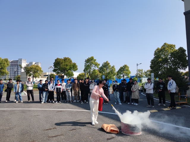 在消防训练环节,陈锦淘为大家详细讲解了灭火器、灭火毯的使用方法、灭火的规范操作流程等,并进行实操示范。在工作人员指导下,师生们依次上前亲身实践,经过几轮实操体验后,师生们基本掌握了灭火器的使用原理和方法。