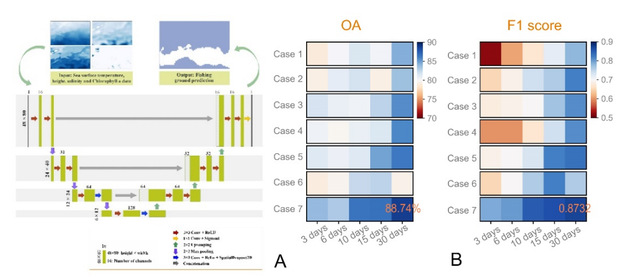 论文根据中国远洋渔业数据,结合海洋遥感数据,建立深度学习的“端对端”渔场预测模型,并针对特定渔场类型设计了非对称个性化时空尺度方案进行分析,最终总结时空尺度变化规律与最优环境组合模型,此研究结果对其他大洋性经济物种的渔场分布研究具有启发和示例作用。