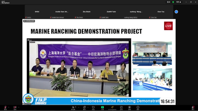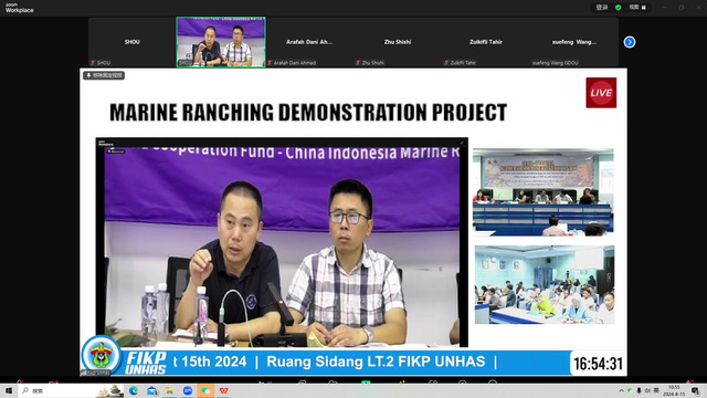 会上,学校刘必林教授对印尼参会的各位老师、学生介绍了全国生态日的意义和中印尼共同建设海洋牧场的意义,并对3年来的工作进行了简单总结。哈桑努丁大学Adi副校长对中国项目团队邀请学校师生参加中国生态日活动表示感谢,同时感谢中国帮助印尼建设海洋牧场,保护印尼的海洋生态环境。他表示,中国拥有海洋牧场建设的丰富经验,希望未来能帮助印尼通过海洋牧场建设保护海洋环境和珊瑚礁生态系统,提升渔业资源养护水平。哈桑努丁大学海洋科学与渔业学院Safruddin院长也代表学院感谢能受邀参加此次活动,同时感谢过去3年中国项目团队为印尼培训了300多名渔业技术人员,联合培养了多名哈桑努丁大学的研究生,这些工作帮助印尼培养了海洋渔业技术人才,解决了印尼当前渔业技术人才力量不足的问题。