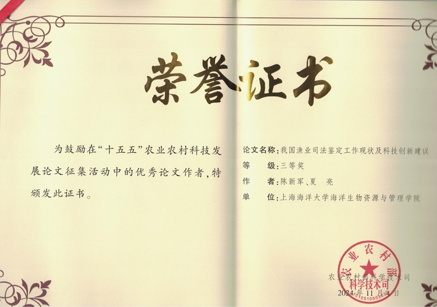 近日,农业农村部科学技术司公布了关于“十五五”农业农村科技发展论文征集活动获奖情况,我院教师陈新军、夏亮的论文《我国渔业司法鉴定工作现状及科技创新建议》获得三等奖。