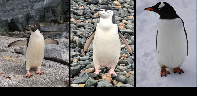 南极长城站阿德利岛上典型的三种企鹅种类(从左到右:阿德利企鹅、帽带企鹅、金图企鹅)