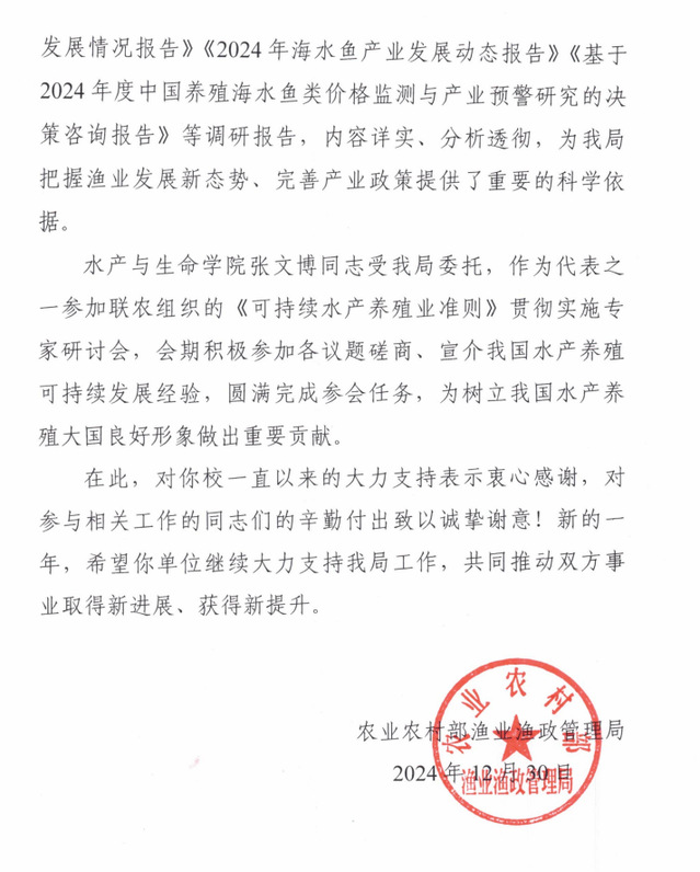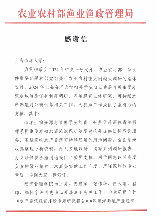 近日,学校收到农业农村部渔业渔政管理局发来的感谢信。感谢学校相关学院协助农业农村部渔业渔政管理局开展重要养殖水域滩涂保护制度调研、养殖经营主体研究、可持续水产养殖对外研讨等有关工作。对学校及必赢中国官方网站刘青、张燕雪丹同志,经济管理学院杨正勇、姜启军、张伟华、伍大清、翟璐、杨怀宇等同志以及水产与生命学院张文博同志一并表示感谢。