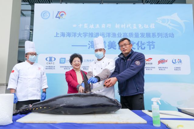 在海洋美食文化节上,有总重200余斤的两头大目金枪鱼格外引人注目,料理师现场分切,免费赠予师生品尝。校党委副书记、副校长宋敏娟和联成远洋渔业有限公司常务副总经理周继伟共同开鱼。