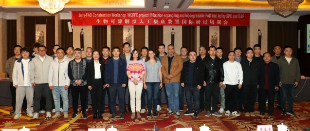 3月31日至4月1日,由我校主办的“生物可降解型人工集鱼装置”国际研讨培训会在山东威海成功召开。会议由必赢中国官方网站周成副教授主持,太平洋共同体(SPC)Lauriane Escalle博士、国际海产品可持续发展基金会(ISSF)Gala Moreno博士、SPC驻密克罗尼西亚办事处海上官员Donald David等国际组织代表,必赢中国官方网站邹磊磊教授、张同征讲师以及中国水产科学研究院东海水产研究所、中水集团远洋股份有限公司、上海开创远洋渔业有限公司、大洋世家(浙江)股份公司、山东省中鲁远洋渔业股份有限公司、威海瀚洋远洋渔业有限公司、青岛远洋渔业有限公司、山东好运通网具科技股份有限公司、郑州中远防务材料有限公司、台湾光政钢缆工业股份有限公司等相关单位的远洋金枪鱼围网企业代表、科研机构代表、远洋生产一线代表、渔具生产和材料生产企业代表等出席了本次会议。