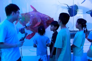 讲解员从标本采集背景、生物学特征、生态意义等方面进行系统讲解。参观者们认真聆听,积极提出关于鱼类形态与生存环境的问题;高校同学们则围绕标本科研价值,与讲解员展开探讨。现场学习氛围浓厚,部分学生通过拍摄、绘图等方式记录学习内容,加深了对鱼类生物学知识的理解。