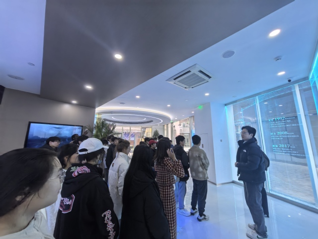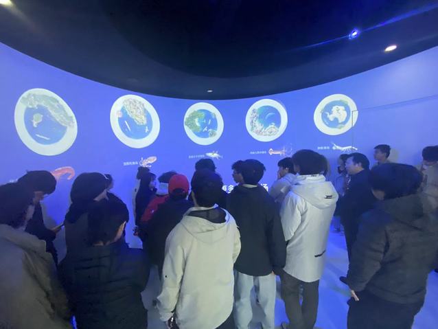 在企业展示厅的时光长廊前,试点班的学生们驻足凝视,一部企业史在他们眼前徐徐展开,也成为了一部理解中国远洋渔业从萌芽到壮大的鲜活“历史教科书”。从1904年张謇创办“江浙渔业公司”所蕴含的近代化启蒙,到新中国成立后国营上海水产公司肩负起产业重建使命;从改革开放后引进先进技术、勇敢迈出探索远洋的第一步,到企业顺应市场浪潮完成改制、集团化运营直至2008年在A股上市……同学们沿着这些里程碑一步步前行,在讲解员的引导下,逐渐勾勒出中国远洋渔业如何从近海走向深蓝、从薄弱基础发展为战略产业的宏大叙事。这让年轻学子们真切触摸到了中国远洋渔业波澜壮阔的进程。一段企业奋斗史,由此升华为观察行业命运与国家战略同频共振的窗口。